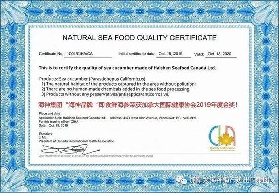 海神集团的海参获加拿大主流;国家健康协会唯一授予;2019年金奖。